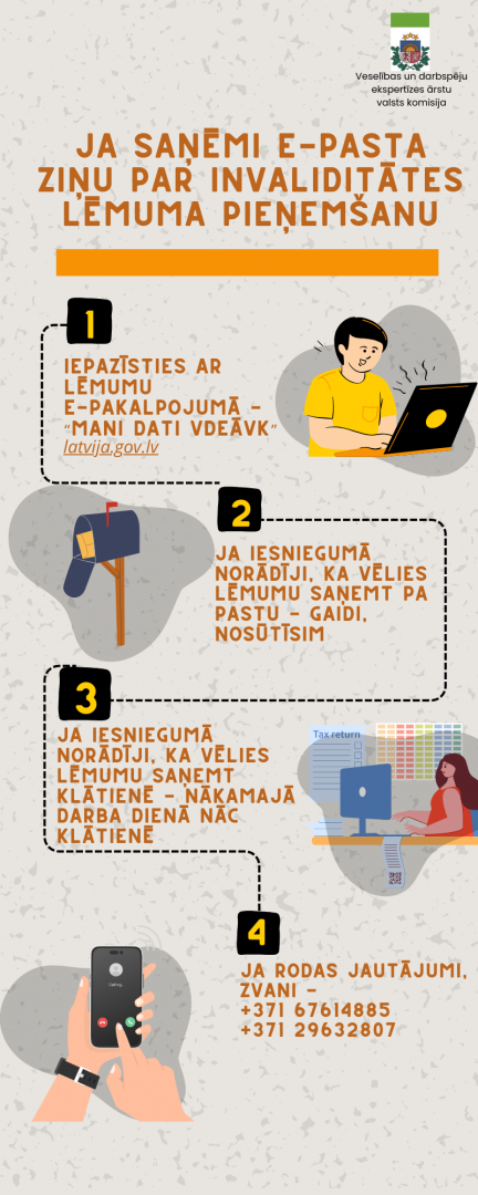 Veselības un darbspēju ekspertīzes ārstu valsts komisija informē, ka saņemot e-pasta ziņu par invaliditātes lēmuma pieņemšanu, ar lēmumu var iepazīties e-pakalpojumā "Mani dati VDEĀVK" - https://latvija.gov.lv. Ja iesniedzot iesniegumu par invaliditātes noteikšanu tika atzīmēts, ka lēmumu vēlaties saņemt pa pastu, tad tas tuvāko dienu laikā tiks izsūtīts uz norādīto adresi. Savukārt, ja iesniegumā tika norādīts, ka lēmumu saņemsiet klātienē, tad lēmumu saņemt ir jānāk nākamajā darba dienā, pēc ziņas saņemšanas.